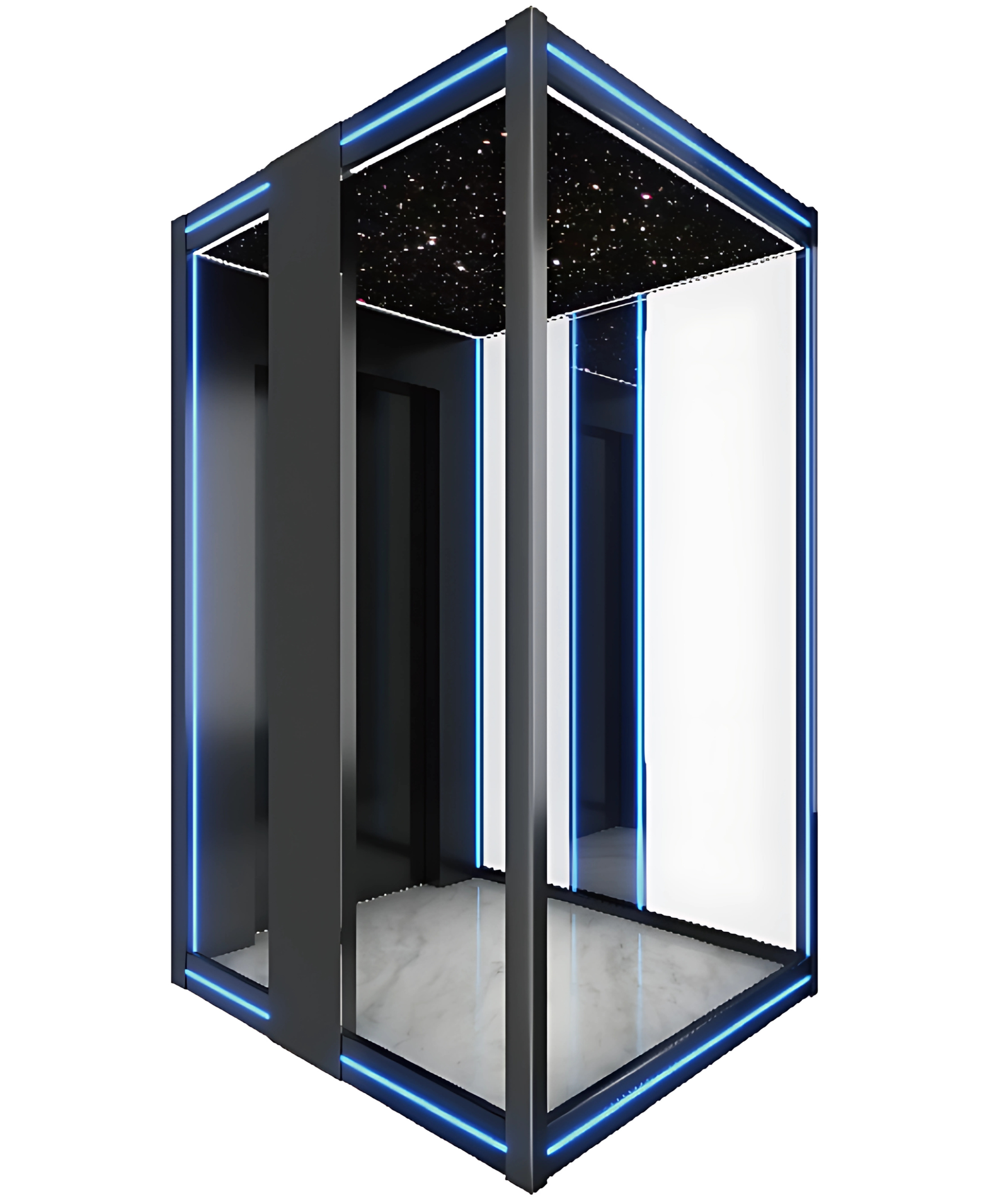 MẪU THANG KÍNH QUAN SÁT TDTC – 019 Trần cabin: Viền hợp kim nhôm đen, bảng acrylic hình ngôi sao và đèn led trang trí. Vách cabin: Vách sau và 2 vách hông được làm bằng kính cường lực trắng được bọc bằng tấm inox 304/1.2mm Bảng điều khiển được đặt âm vào đố cabin…